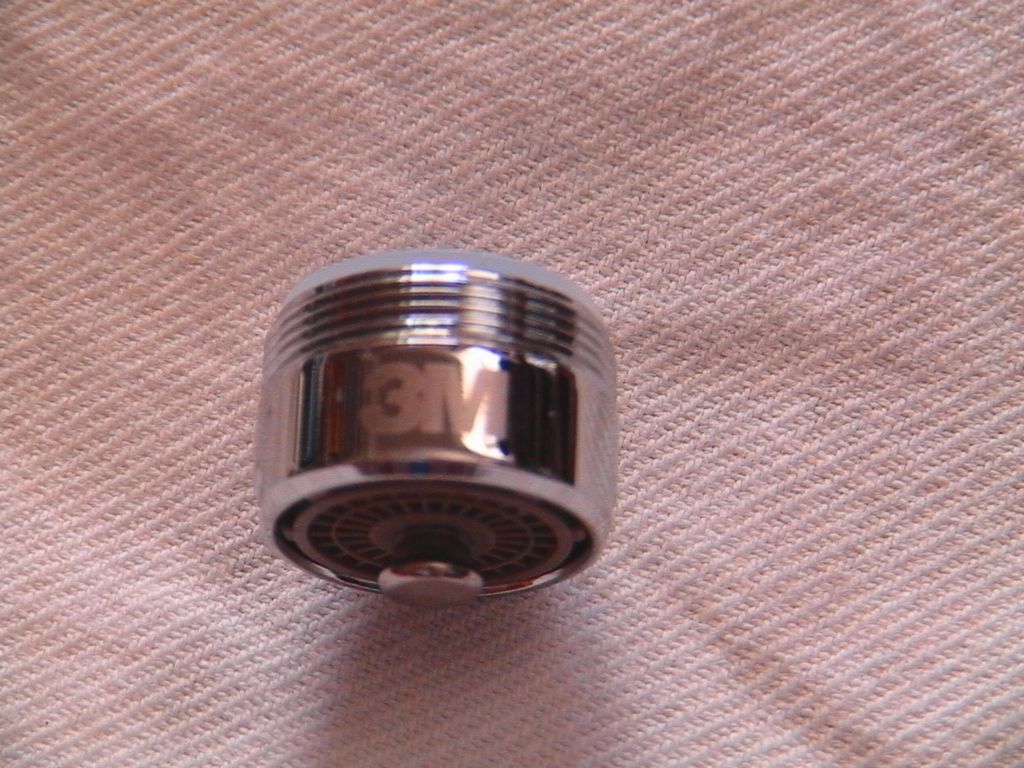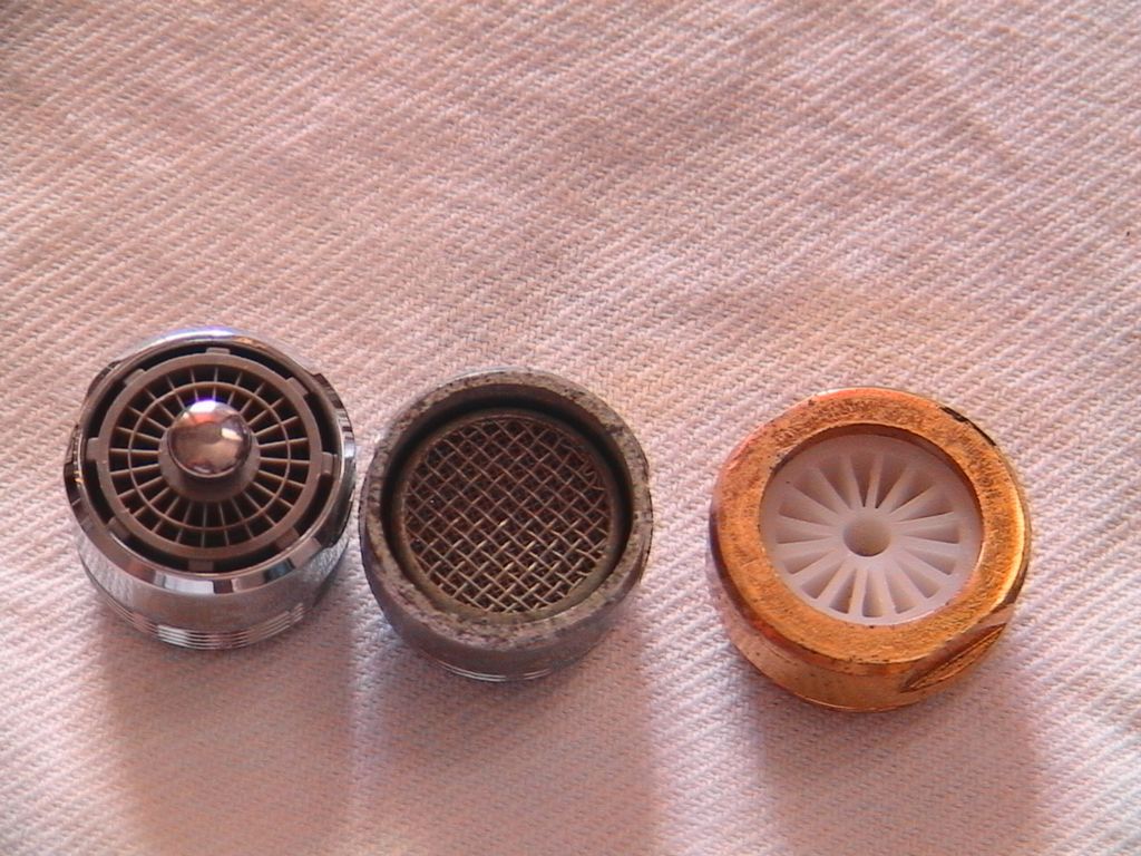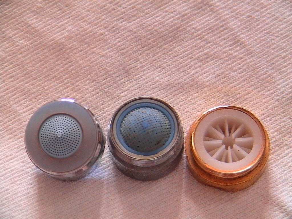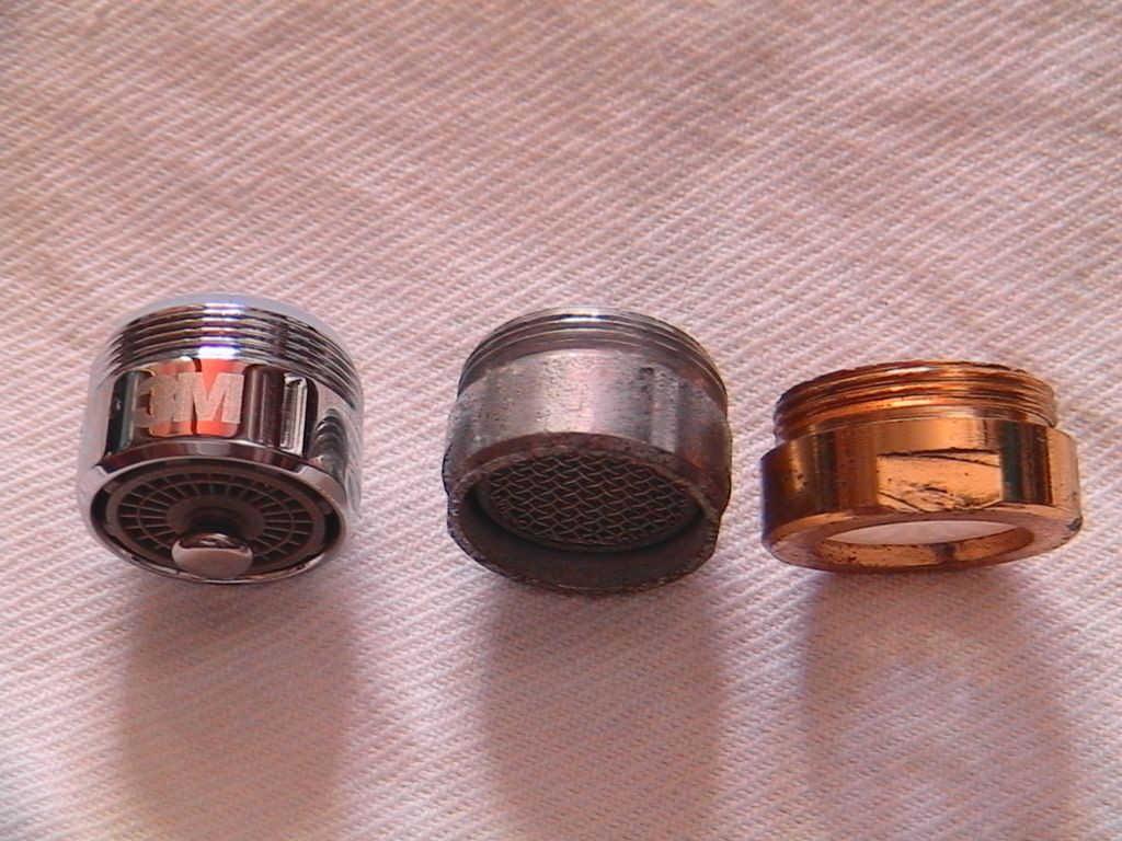 一般水龍頭的起泡器與3M省水閥相比(左邊是3M省水閥、中間是浴室洗臉檯水龍頭起泡器、右邊是廚房的)